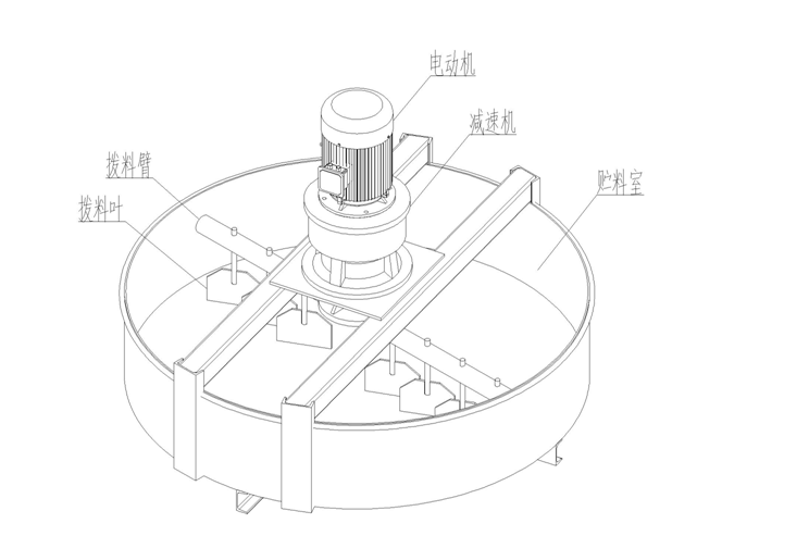 立式喂料機由盤體、撥料臂、機架、減速機、電動機等機構(gòu)組成,其工作方式是通過電動機驅(qū)動減速機,然后帶動整個撥料臂勻速旋轉(zhuǎn),從而使得交錯排列的撥料葉對物料進行均勻撥料。隨著撥料臂的旋轉(zhuǎn)從而使物料均勻流出。出料口可根據(jù)需要控制開啟大小以控制流量,以保證下道工序正常生產(chǎn)。