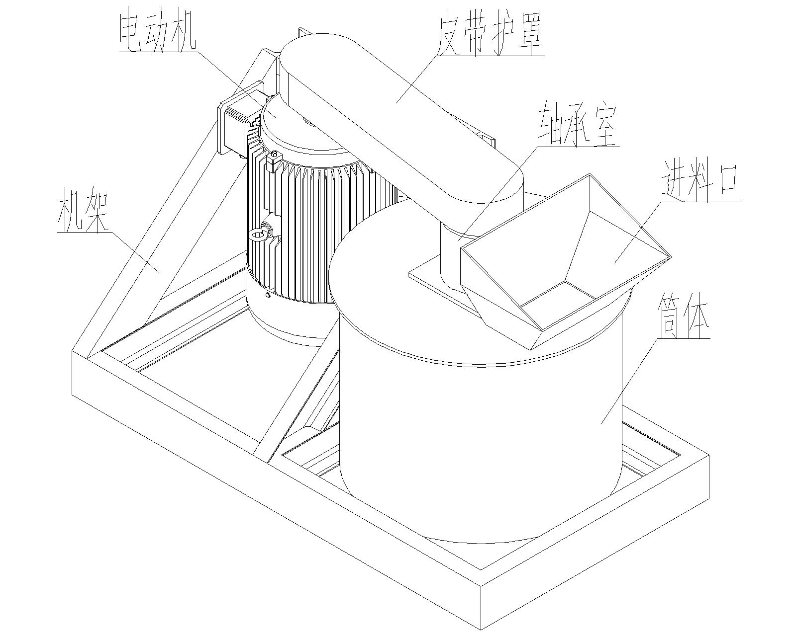 構(gòu)造組成:結(jié)構(gòu)由下機架、機殼、上下軸座、主軸、轉(zhuǎn)子盤、鏈條、錘頭、皮帶輪、電機架等部份組成。動力經(jīng)三角帶帶動主軸旋轉(zhuǎn),主軸有上下兩個軸承座,軸承座安裝在機殼的上端和下端。機殼總成安裝在下機架上,主軸上裝有轉(zhuǎn)子盤和鏈條,加料斗裝在機殼上部,為了裝卸錘頭方便,機殼上開有活門,便于拆裝維修。